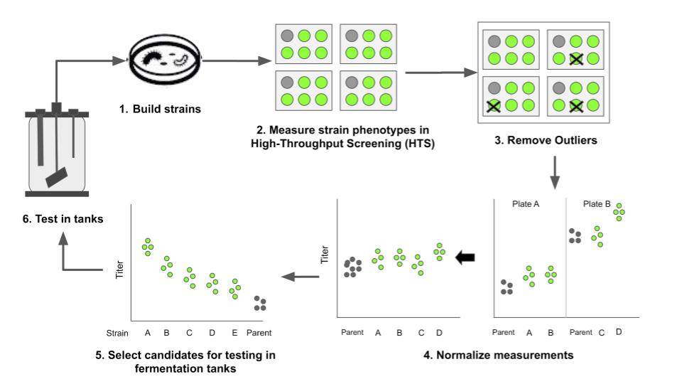 The purpose of HTS is to quickly and cheaply screen thousands of genetic mutations-many of which are anticipated to have zero effect on the desired phenotype-to identify the rare few that do. Identifying truly improved strains, however, can be difficult for at least three reasons.
